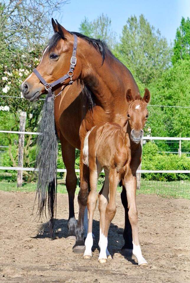 By Kosmonaut, senior champion in show, race horse performer who was used as an improver by the Trakehner stud-book. Kosmonaut is the full sibling to the Holland national champion Karnaval, sire, between many other ones, of Valujevka, one of the best race mare in Russia, winner of the 2011 WAHO Trophy and dam of 14 excellent racehorses, used with great success in breeding too. The dam of Kosmonaut is the legendary Karinka 2/21 (8-8-2-1-2),, the dam of Drug, Dre***, 5/35 (13-9-4), European show champion and winner of three prestigious stake races : the Russian Derby, the Coupe d’Europe in Evry and the Al Nayan International at Kempton Park in England. Drug is the sire of our former broodmare Pokupka, of the endurance horse producer Karesi DRE*** and of numerous wonderful race and show horses.