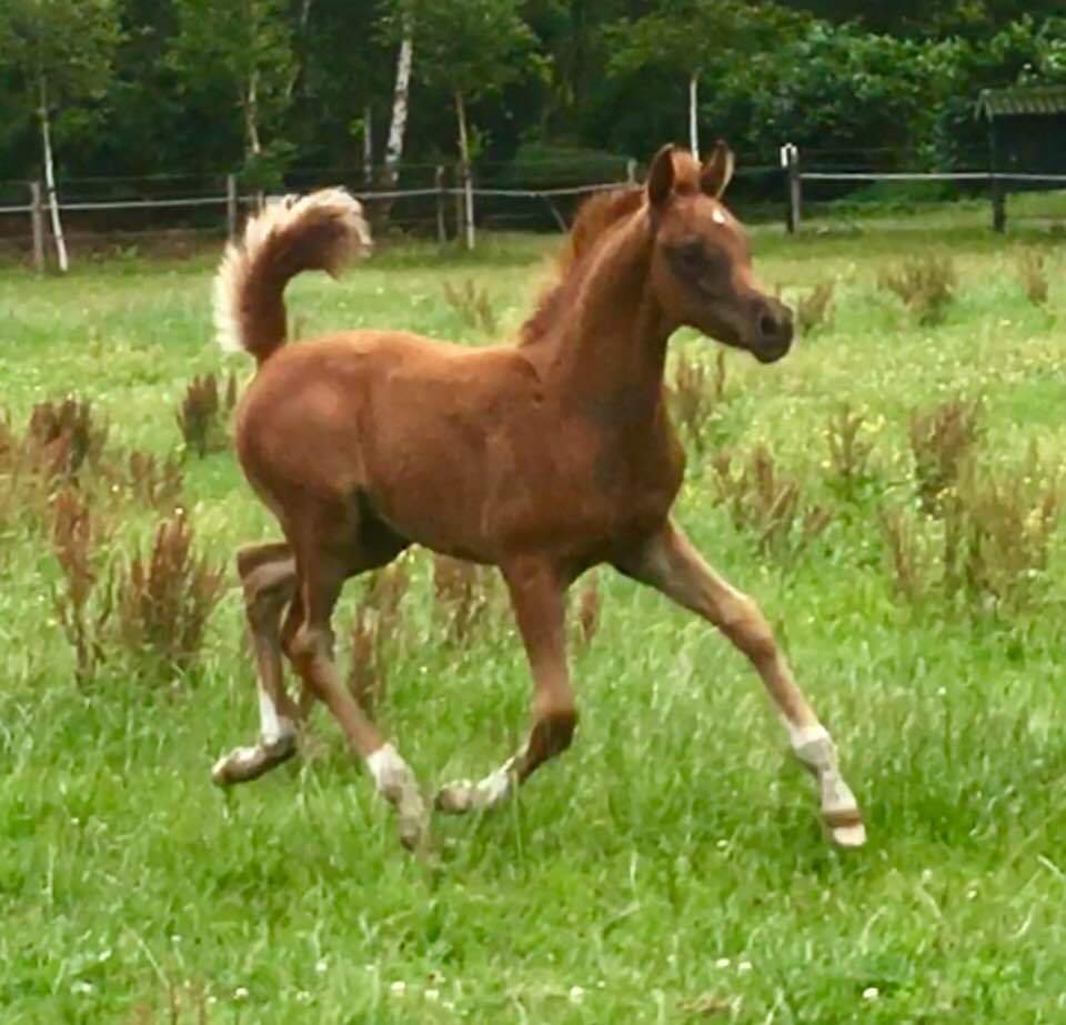 Par MM Sultan, étalon Elite et 2nd premium, triple champion national en Hollande, cheval ECAHO Star. MM Sultan est un grand étalon et appartient actuellement à Davidson Arabians, Danemark. Il est un fils du célèbre Kubay Khan, également étalon Elite, cheval star de l'ECAHO et étalon, entre autres, du très bon Nakubaya Kossack, vainqueur de concours internationaux. Le père de Kubay Khan est le célèbre Kubinec DRE**, champion du monde, d'Europe et de la Coupe des Nations, également étalon de Tibet. La mère de MM Sultan est la précieuse poulinière Alaska QQ, jument d'élite et meilleure productrice par le grand Vatican, 6 fois gagnant de Gr1 issu d'une rare lignée de père napolitaine. Elle est la mère de plusieurs bons chevaux de concours en Hollande comme Alkan et MM Cairo.