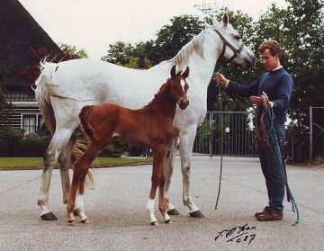 Naslednik gave high quality offspring who is precious for breeding : Poshlina, european champion, Karavan, All Union exhibition reserve champion, Pechenga, great-mother of Pokupka, who gave with Balaton the dressage champion Pechaton; Pozjarka, the dam of Pokupka and Palatonja, 1rst premium mare, national champion in the Nederlands and dam of the excellent broodmare Palanika (Nikel) owned by my friends of Arabian Fantasie ; Pedruga (Drug) successful endurance horse and broodmare in UAE.