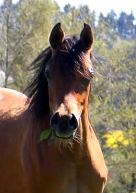 La très belle Maïa est une jument courte et compacte, avec une très jolie tête au front large, de beaux yeux, un ensemble dos, rein et croupe très bien attaché. La croupe est longue et plate avec un bassin bien oblique et une attache de queue haute. On remarque aussi une belle profondeur de poitrine et beaucoup de charisme typique de la race Arabe.