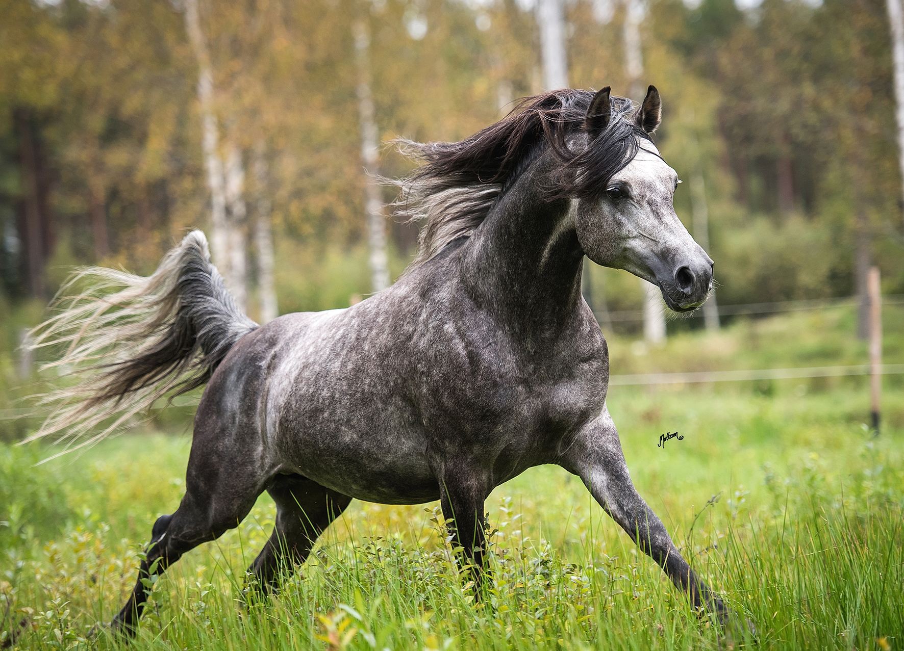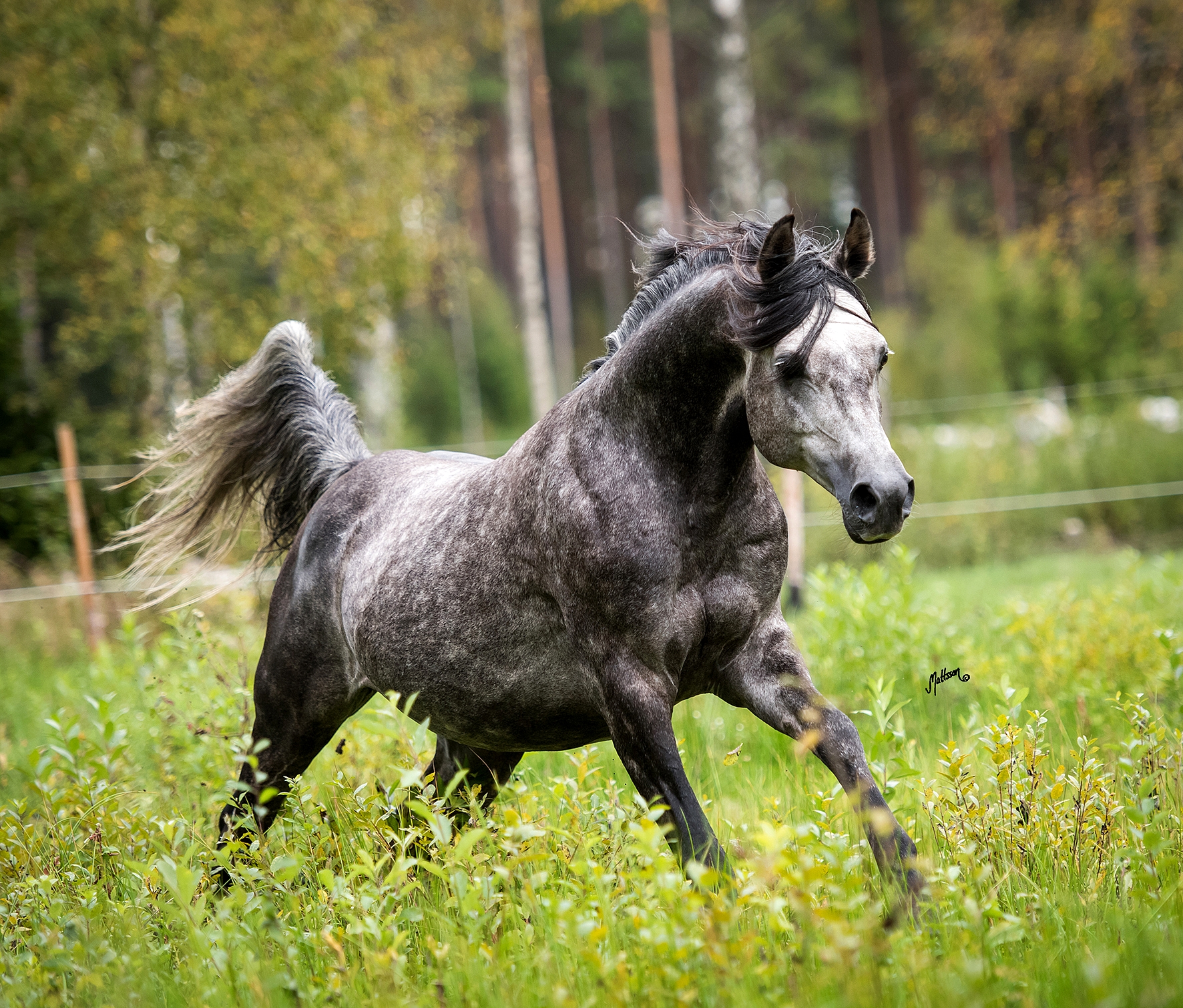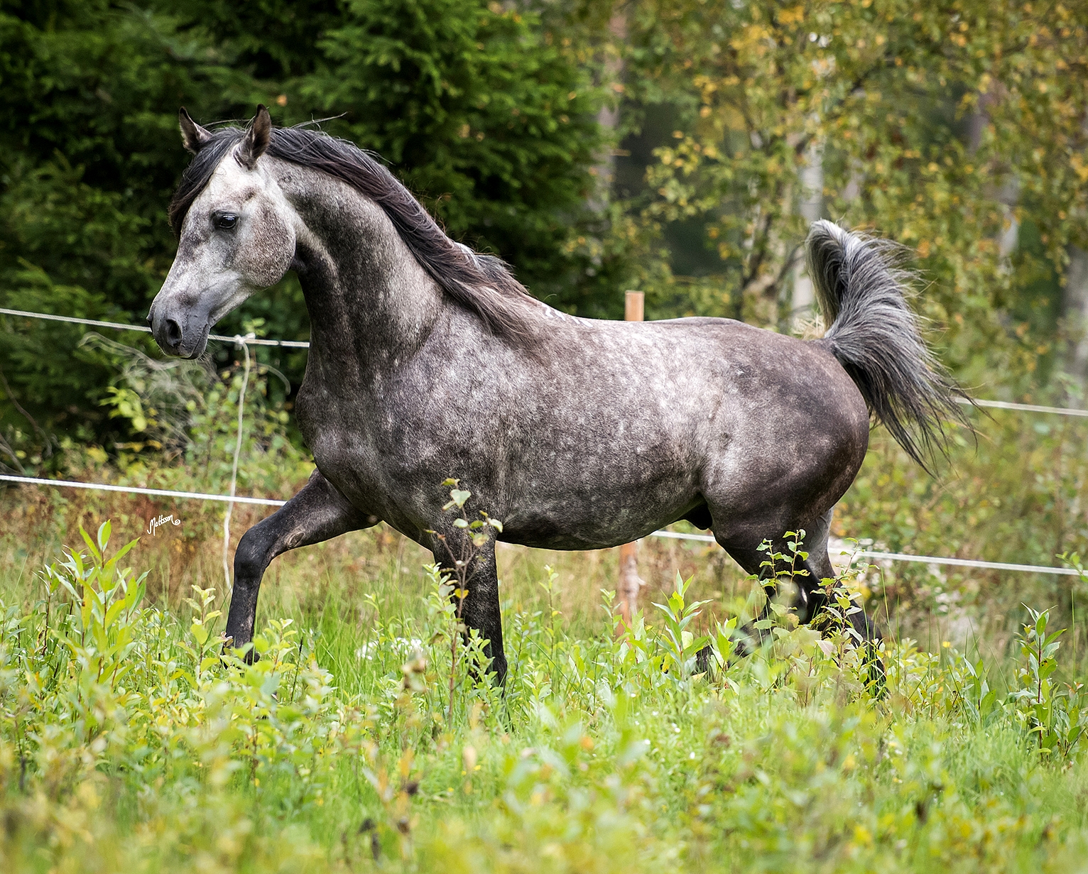 Je contactai donc Elena Werdenberg, qui gère les relations commerciales de Tersk Stud avec les clients étrangers et est également une collègue Juge, pour lui exprimer mon intérêt pour Prize Tersk. Deux ans plus tard, un message d’Elena : « Nous voulons savoir si tu es encore intéressée par Prize ». Je n’ai pas hésité une seconde. Le superbe gris sombre, fils du légendaire Moment, hors de la très bonne lignée maternelle de Pantomima, allait rejoindre la collection d’étalons purs russes de Faber Arabians !